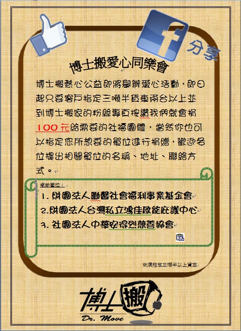 *即日起只要客戶指定三噸半貨車兩台以上並到博士搬家粉絲專頁讚我們就會捐100元給需要的社福團體